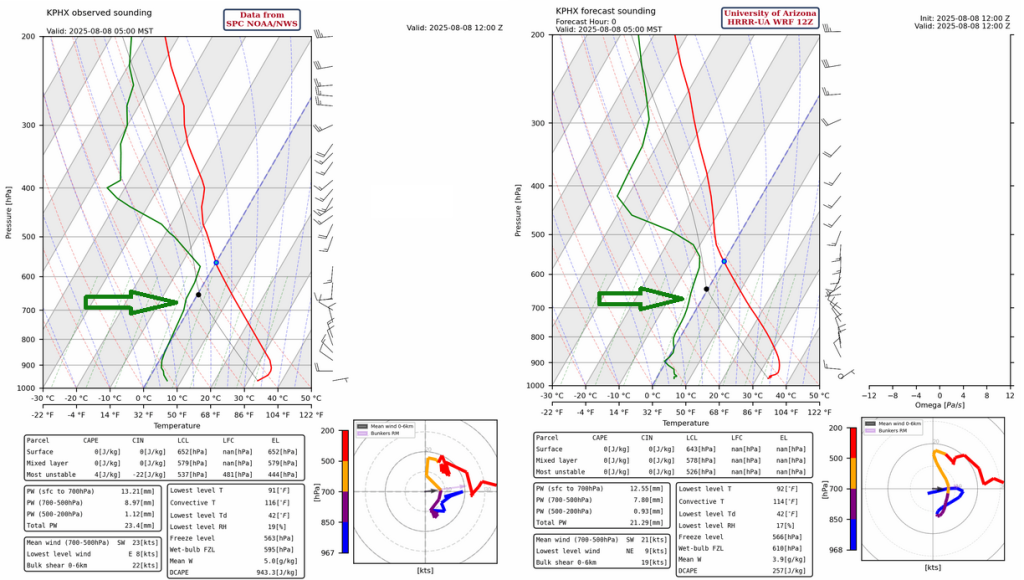 Soundings for Phoenix also shows the beginning of the surge below 900mb. The HRRR-UA WRF 12Z initialization for Phoenix (below right) does show the surge, but it is light on water vapor between 900 and 600mb compared to the observed sounding (below left). The result is that precipitable water from the observed sounding is about an inch while the model is 0.1″ less. Still, the 900-600mb profile is drier in the forecast, and just a small difference can make all the difference.