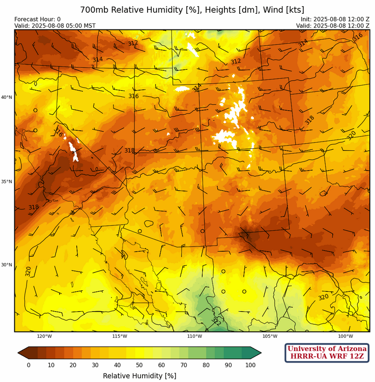 The ridge at 700mb is in two locations this morning with a center over Yuma and another center further east over north Texas. A ridge axis is between the two centers. Westerly winds are north of the ridge axis with easterly flow underneath the ridge axis, except in southeast Arizona where the wind flow is from the north.