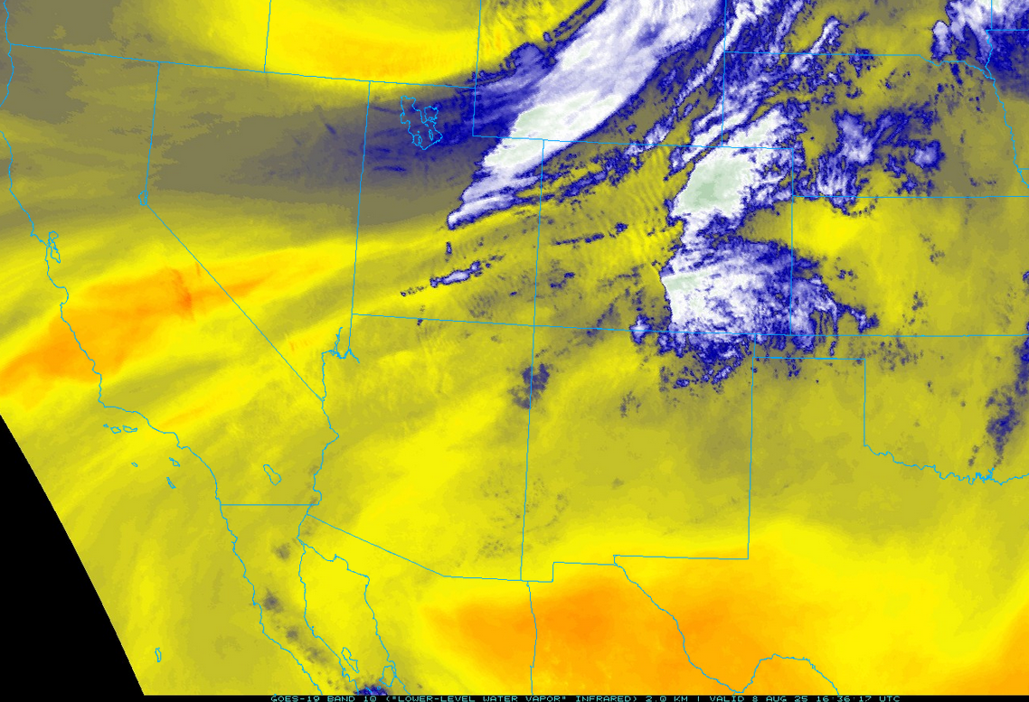 The low-level water vapor satellite image this morning shows a synoptic scale trough in Idaho. This is drawing the surge moisture northward.