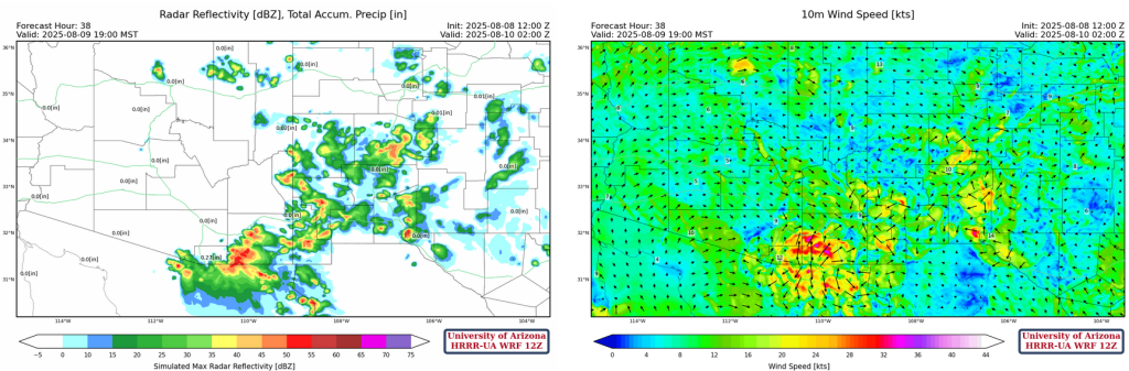 The overnight convection may spoil the potential for storms in Phoenix and Tucson tomorrow, due to a cooler temperuatures in the boundary layer. The HRRR-UA WRF 12Z forecast soundings for Phoenix (left) and Tucson (right) are shown below.