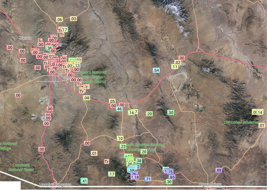 The precipitation totals were generally light as shown by gauge data from Pima County Regional Flood control and Rainlog.org, but extended from the Arizona border northwest to Tucson and Phoenix (where a few drops fell at the airport, trace recorded).