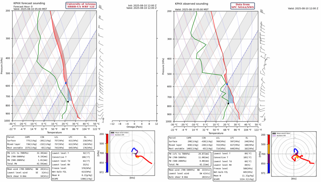 Upper air soundings for Phoenix, forecast initialization (below, left) and observed (below, right), have over 1.6″ (42mm) of precipitable water this morning with moisture assistance from the outflow from the MCC; that’s the positive. On the negative side, is over -200 [J/kg] of convective inhibition (CIN) and the forecast storm motion is from the northwest. Storms will form on the Mogollon Rim, but we will need some strong outflows to get them into Phoenix metro area.