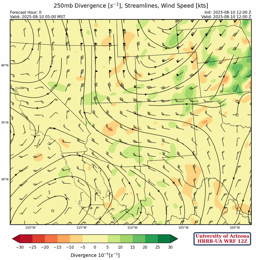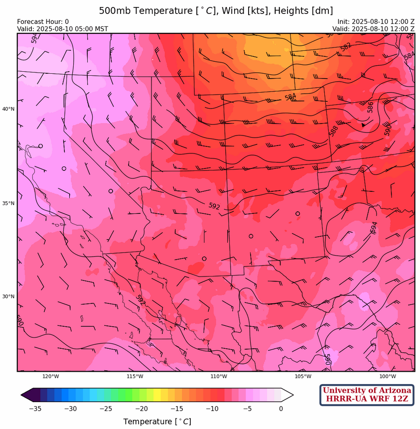 West winds of 15 to 25 knots are at 500mb over northern Arizona/New Mexico between the ridge axis in the central part of the two states and the trough over Wyoming. Light mostly easterly winds are in southern Arizona and New Mexico.
