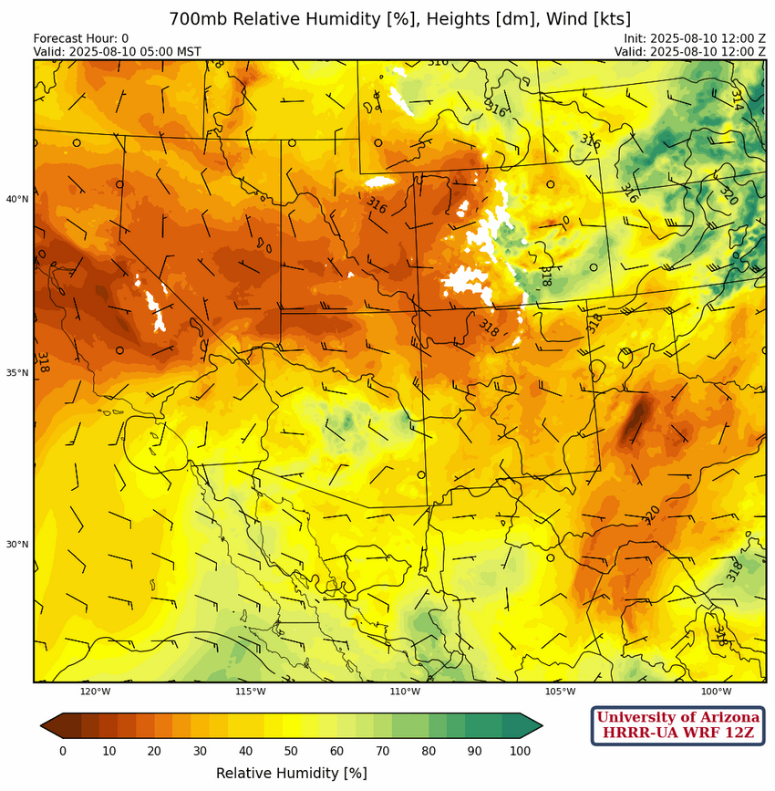 Increased moisture content can be seen across the southern half of Arizona at 700mb. Flow is from the west to northwest across central and northern part of the region turning northerly in southern Arizona.
