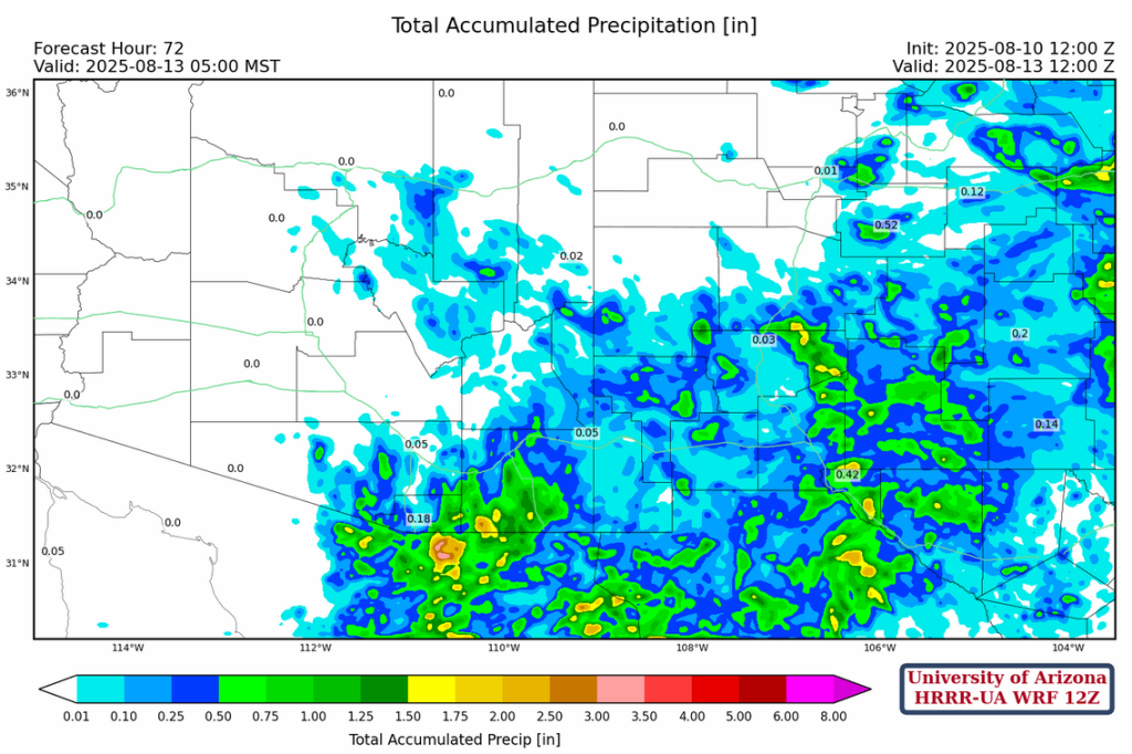 24-hour accumulated precipitation totals are shown from the two most recent HRRR-UA WRF forecasts. 0.5″-1.0″ in parts of Santa Cruz and Cochise county, but a lighter amounts in the Tucson valley; 0.05-0.1″ forecast for the Tucson airport.