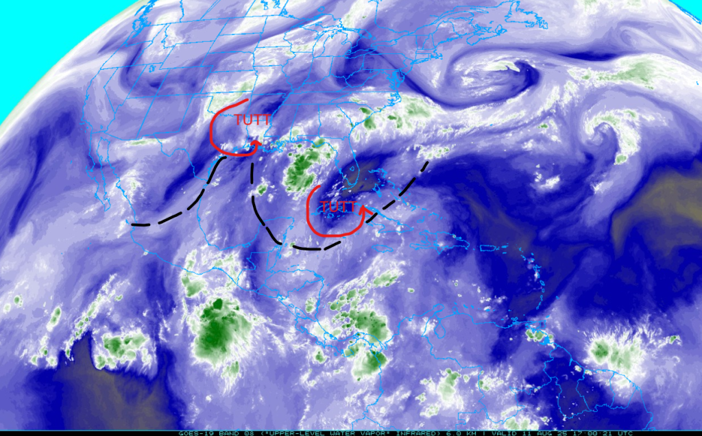 The tropical upper tropospheric trough (TUTT) over Texas is moving north ahead of the trough over the middle of the country, while the TUTT low in the Carribean Sea has a broad circulation centered west of Jamaica. I would expect the TUTT axis to reform further south as the TUTT low in Texas leaves the area.
