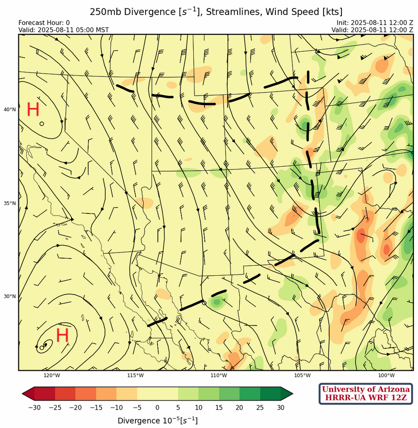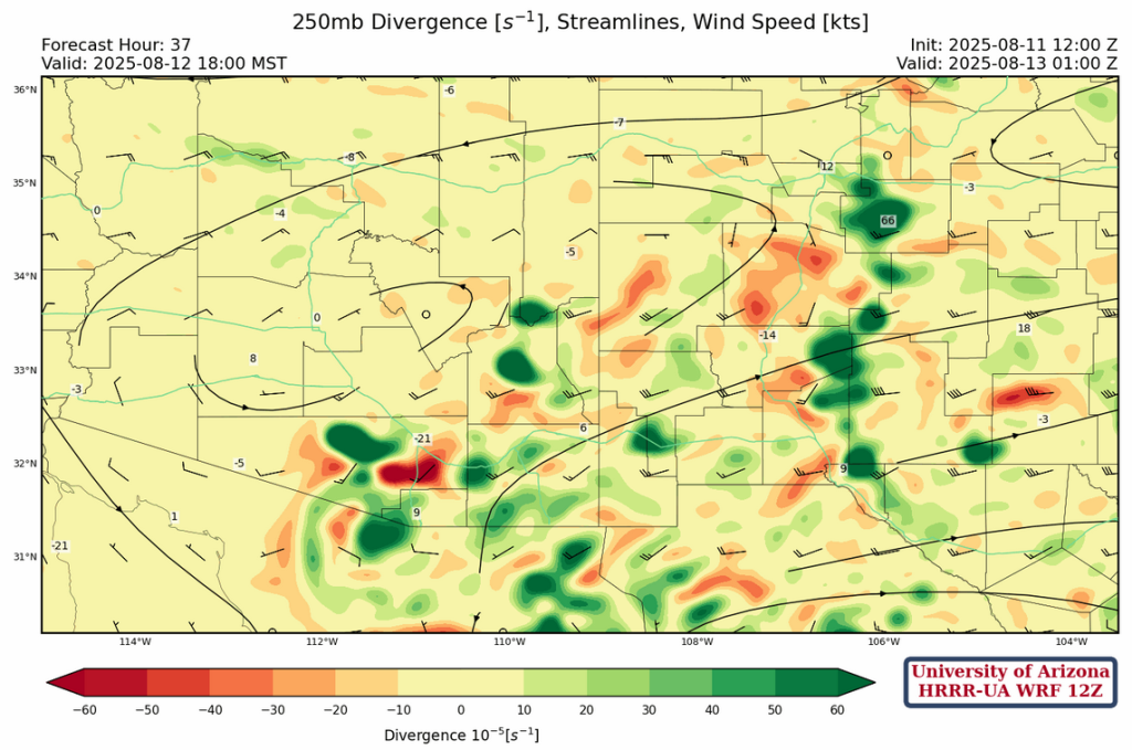 A more active day is forecast for tomorrow, as the short wave over southern Idaho and western Wyoming at 250 mb will drop down and change the northerly winds to westerly with stronger upper level divergence over southeast Arizona and southern New Mexico as shown in the forecast below for tomorrow afternoon at 6pm.