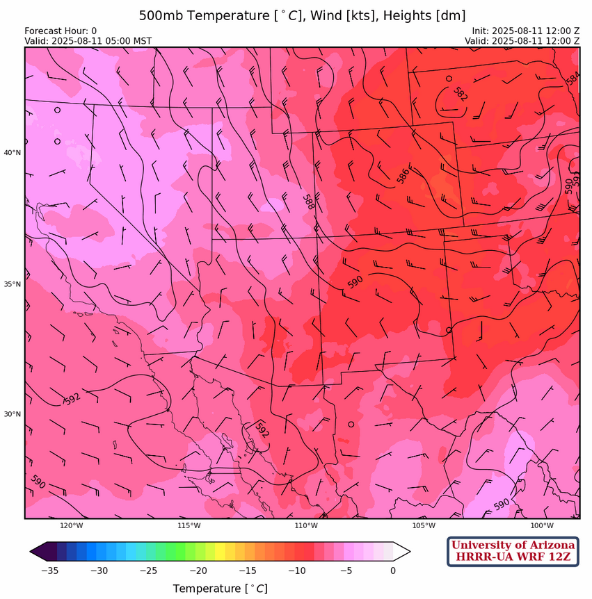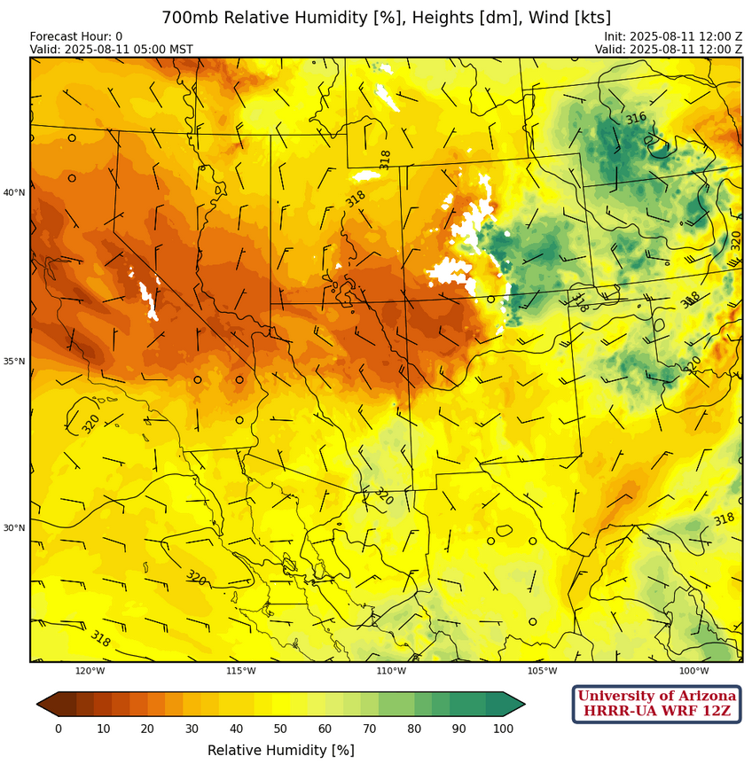 At 700mb, drier air is filtering into the northern portion of Arizona and northwest New Mexico. Note that the deep easterlies in Mexico associated with the monsoon have been suppressed and are well to the south compared to a more typical monsoon pattern.