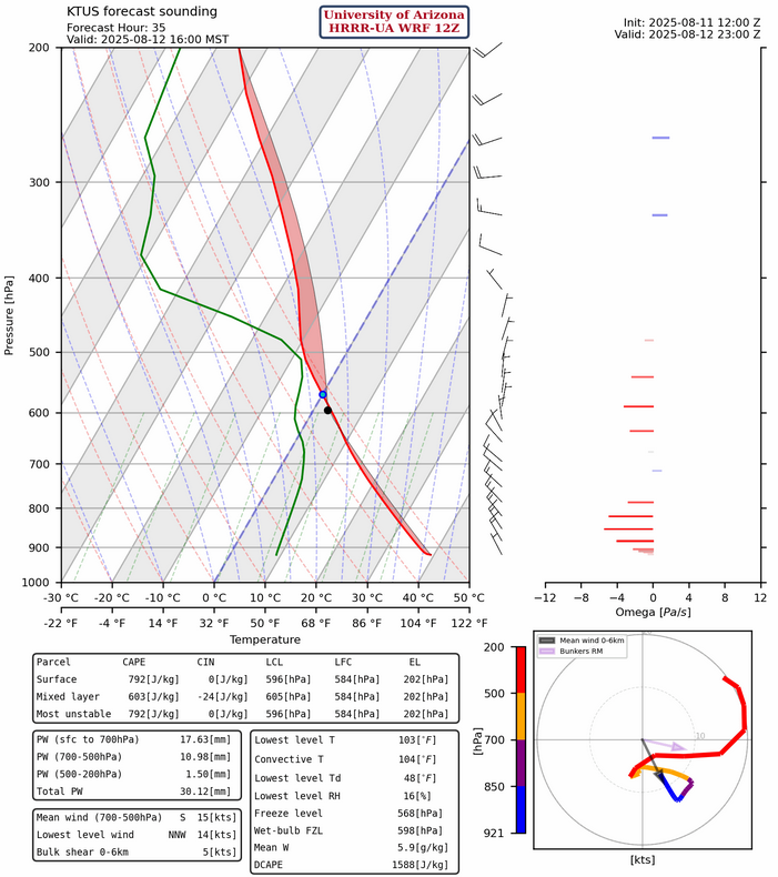 Precipitable water is about 1.5 inches (37mm) at Phoenix which is close to the HRRR-UA WRF 12Z initialization this morning at 35.5mm (within measurement uncertainty). The drawback is wind flow pattern above 500mb from the north, meaning anvils will blow over the where storms would initiate preventing the surface convective temperature from being reached.