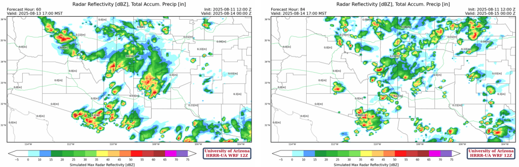 HRRR-UA WRF 12Z radar reflectivity forecasts for Wednesday (left) and Thursday (right) show a continuation of the same pattern. The positive is a little more activity on Wednesday and model forecasts hint at weakened storms moving into Phoenix metro Wednesday evening. The negative is fewer storms are forecast as the week progresses to Thursday.