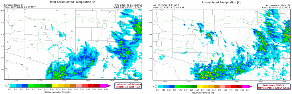 Yesterday’s HRRR-UA WRF 12Z 24-hour accumulated precipitation was similar to the MRMS observations. Good overall pattern, though some of the intensity is missing in the forecast on the Mogollon Rim and in Sonora/Chihuahua.