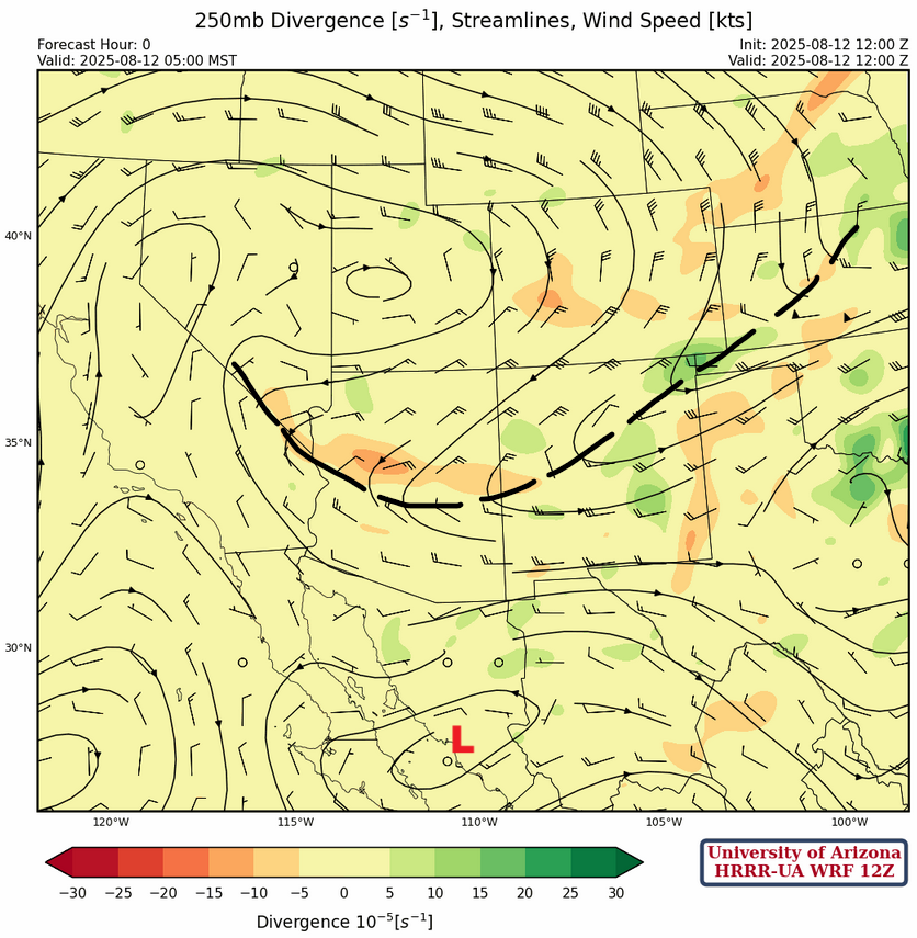 At 250mb, the trough in Idaho/Wyoming has dropped to the south and is across central Arizona and New Mexico. Winds have become easterly to the north of the trough and westerly south of the trough.
