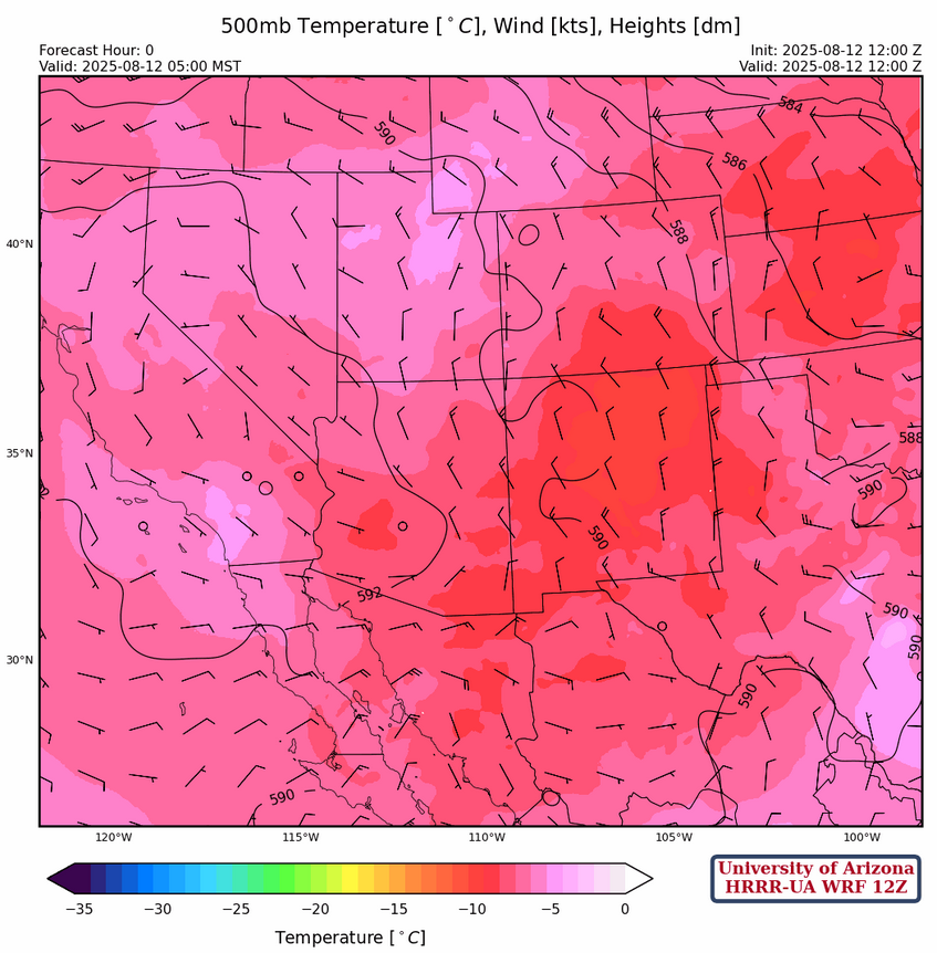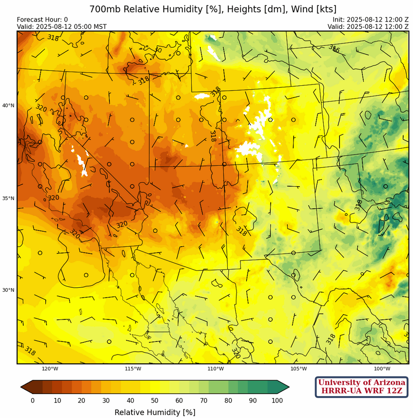 At 700mb, dry air has moved into the northern part of Arizona with an overall decrease in moisture across the region. Note that the higher humidity values in New Mexico are an artifact of cooling from yesterday’s storms rather than an increase in moisture.