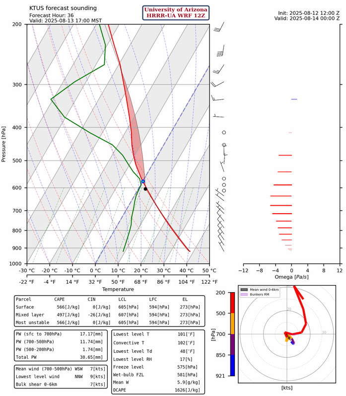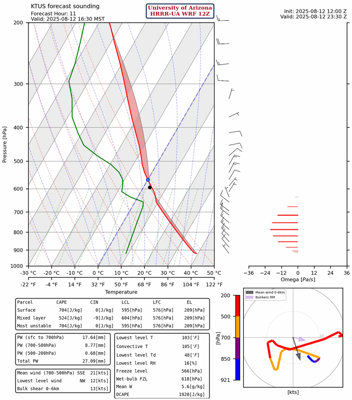 …oddly enough, the HRRR-UA WRF radar reflectivity forecast for the same time period has some storms to the south along the Interational border and in the east counties, but none for Tucson. The sounding shows an inversion layer between 580mb and 650mb that clouds likely can not rise through. Phoenix may get some light showers overnight, from some residual storm cells initiating from the outflow off the Mogollon Rim.