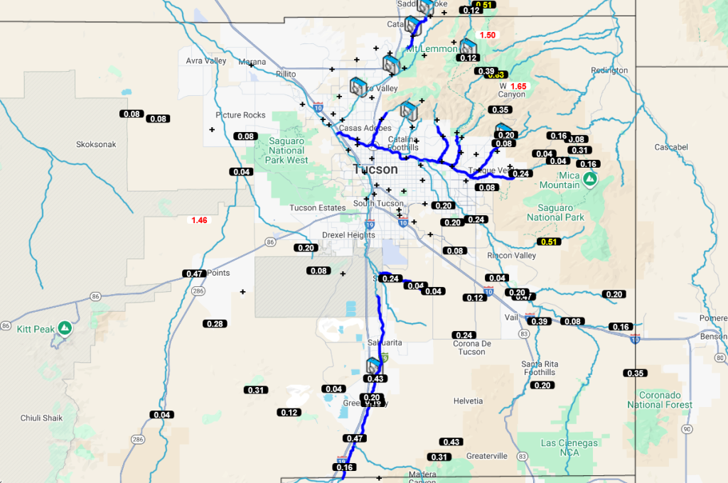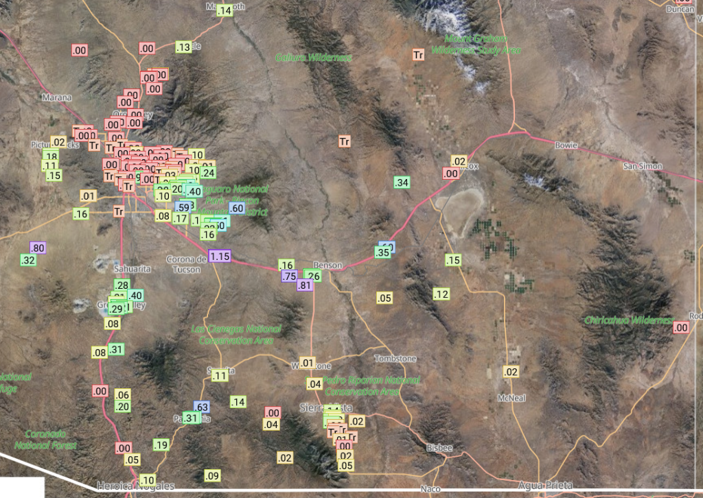 The 24-hour accumulation data below shows the precipitation in southeast Arizona including Tucson, Nogales, and Sierra Vista.