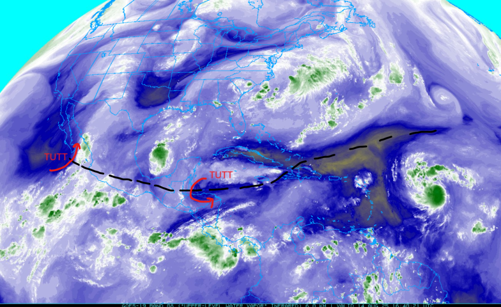It’s hard to find the tropical upper tropospheric troughs (TUTTs) over Mexico this morning, but from the TUTT low eastward the TUTT axis is well defined. An anticyclone located with Tropical Storm Erin is east of the Leeward Islands.