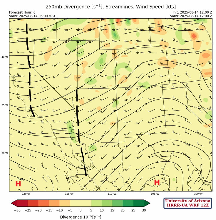 At 250mb, a high pressure ridge is in central Mexico and another ridge is west of the spur of the Baja. A trough has developed between the three ridges and is along the Arizona/New Mexico border. Another trough is over California. Wind flow is west to southwest across the region at 15 to 20 knots.