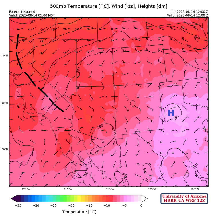 A high pressure ridge is over west Texas at 500mb, with the ridge axis extending west into southern Arizona. The flow is controlled by the MCV over southern Arizona and New Mexico. The trough in California is resulting in southwest winds across the Great Basin.