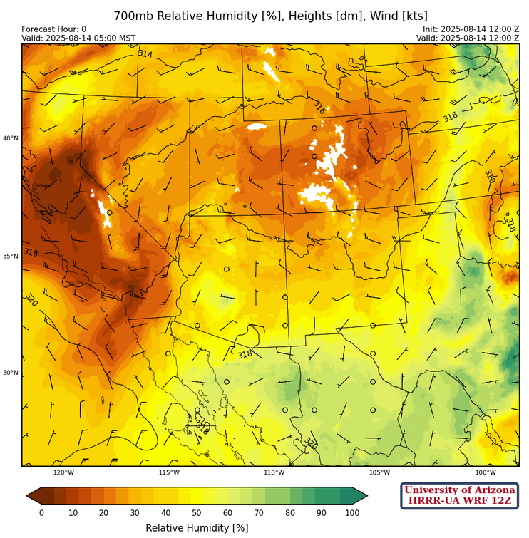 Not that much has changed from yesterday at 700mb except higher moisture values associated with the showers and thunderstorm activity in central and northern Arizona associated with the MCV.