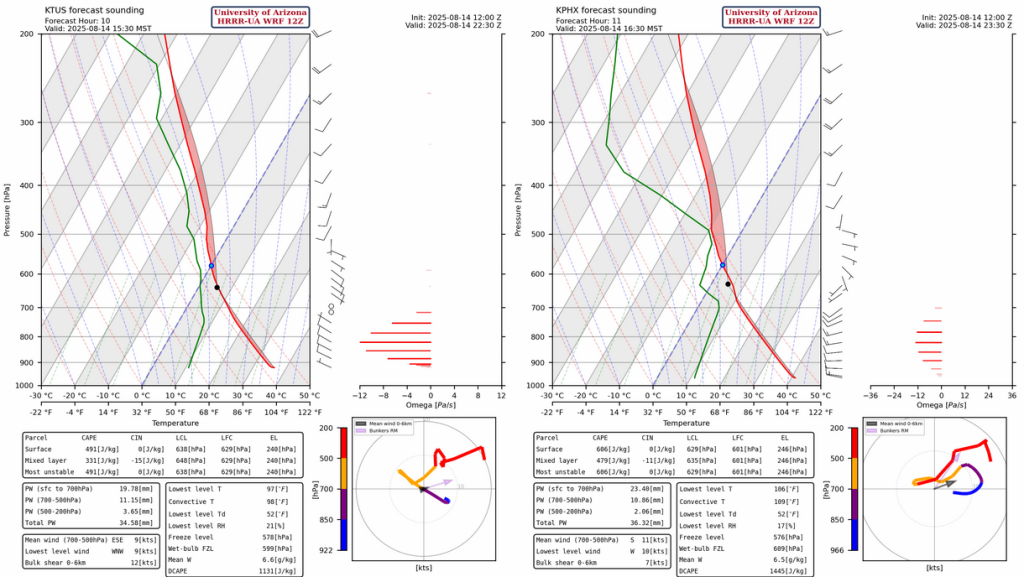 Forecast soundings for Tucson (left) and Phoenix (right) support thunderstorm activity this afternoon, but given the cloud cover can we get to the convective temperature? Tucson it’s 98°F and Phoenix it’s 109°F.