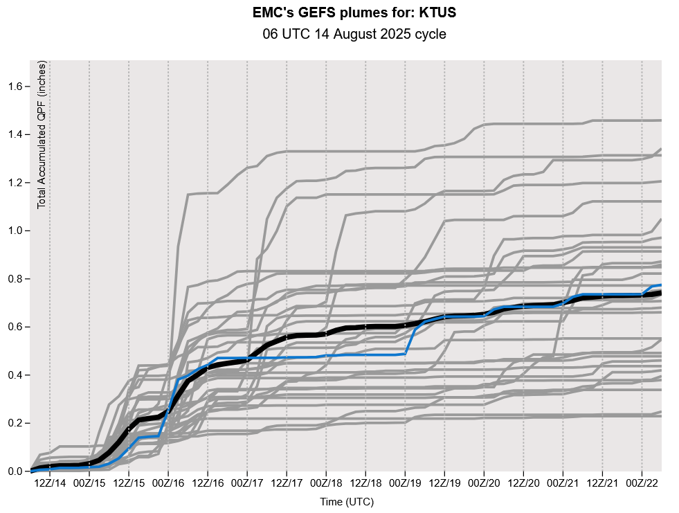 The HRRR-UA WRF 12Z forecast from yesterday (below, left) compared to the observed totals from the MRMS system (below, right) shows the precipitation amounts and location was just about right except for one notable exception. Phoenix, had strong storm pop up that produced 0.5” of rain. There were light showers in the Grand Canyon with relief for the firefighters with higher relative humidity overnight.