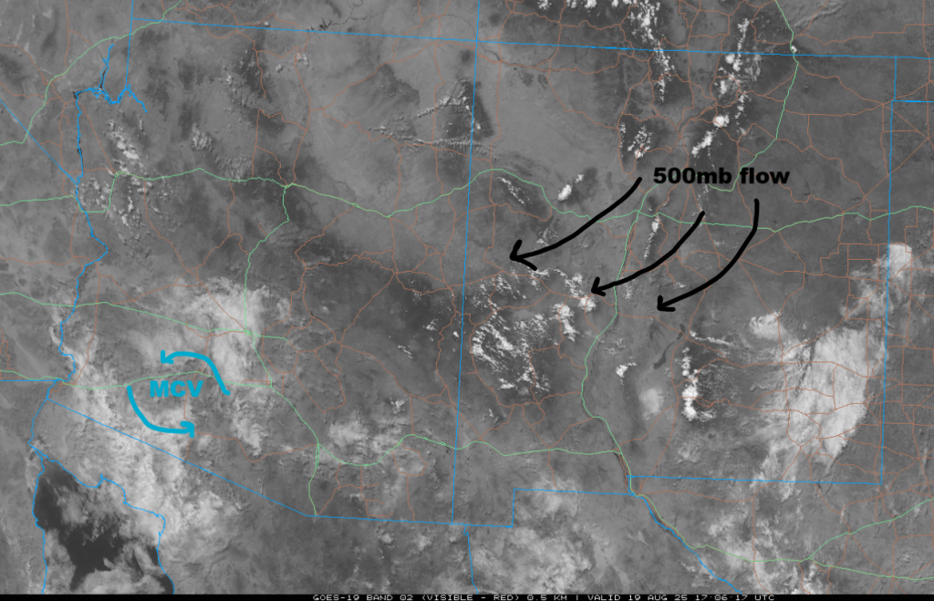 The Mesoscale Convective Vortex (MCV) that was well south of Nogales yesterday has moved to southwest of Lukeville this morning. Broad anticyclonic flow is across the region with the circulation center in northwest New Mexico.