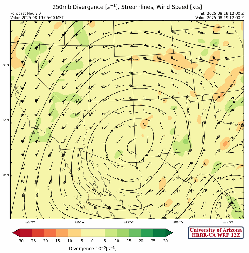The high pressure ridge at 250mb has moved into southeast Arizona as the trough retreated into the Pacific. Anticyclonic flow is dominating the region as can be seen in the 250mb HRRR-UA WRF 12Z initialization below. Over the next 72 hours the ridge will move to the four corners, while the TUTT low in south Texas moves westward to the middle portion of the Baja Peninsula.