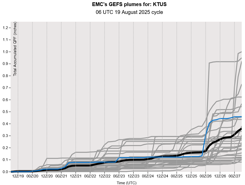 The GEFS plumes show the low grade monsoon pattern continues through the week, but maybe more activity next week as we head towards the end of August.