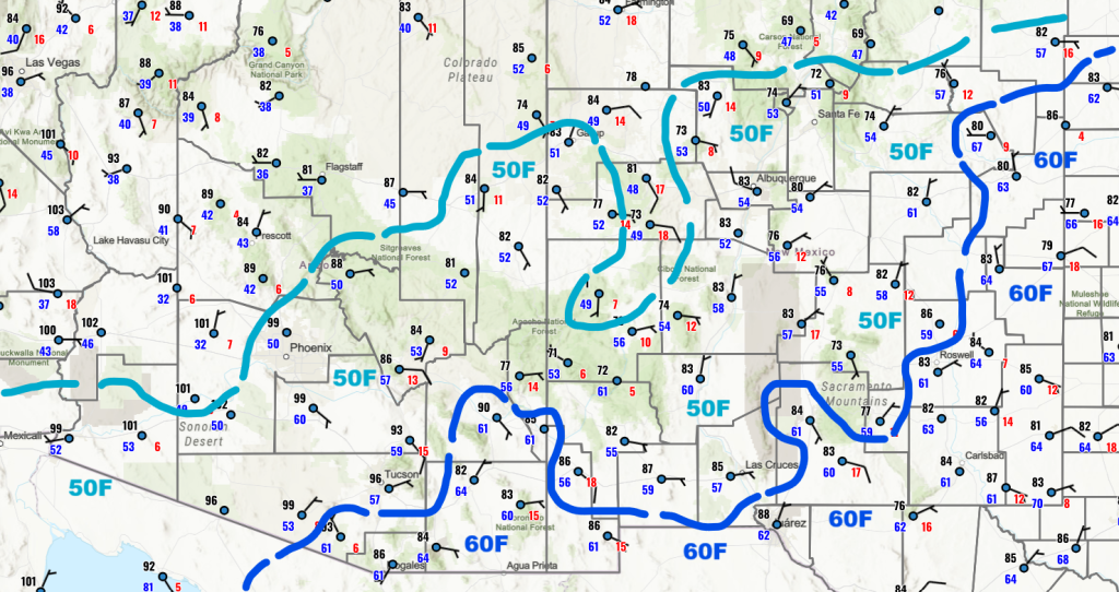 Looking at surface dew point temperatures for this morning, there’s not much change since yesterday except where it rained in eastern Arizona in the White Mountains.