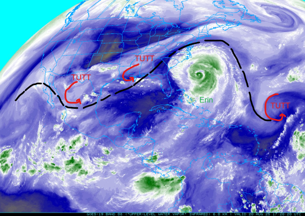 Hurricane Erin is producing dangerous surf rip and currents, as well as storm surges on the North Carolina coast as it swings northeast of the Atlantic coast. There may be some tropical storm conditions on the Virginia coast on Thursday. The tropical upper tropospheric trough (TUTT) is being pushed way to the north due to the anticyclone and in a day or so will reform further south.