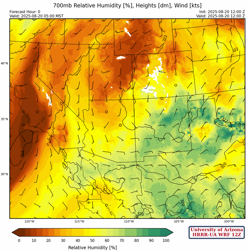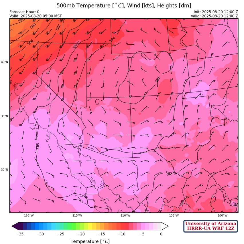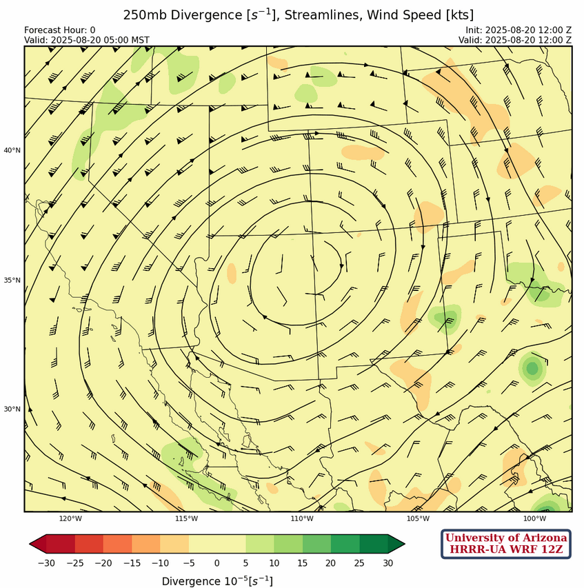 The ridge at 500mb is a little north of its 250mb location and easterlies across the region should help move thunderstorm that develop to move west towards the low deserts. The flow is strong enough that the storms will move further west than yesterday before dissipating.