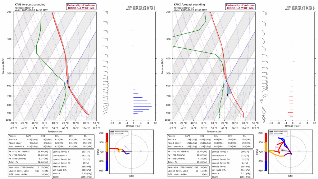 The forecast sounding for Tucson this afternoon at 2:30pm (below, left) indicates thunderstorms form in the early afternoon from Tucson to Nogales and move west to Sells before running into dry air. The forecast sounding for Phoenix tonight at 10pm shows CAPE above the boundary layer, similar to the Tucson forecast. Storms moving off the White Mountains will slowly dissipate as they move west into the desert, but they could reach the Phoenix area in the late evening and there is enough CAPE for light precipitation.