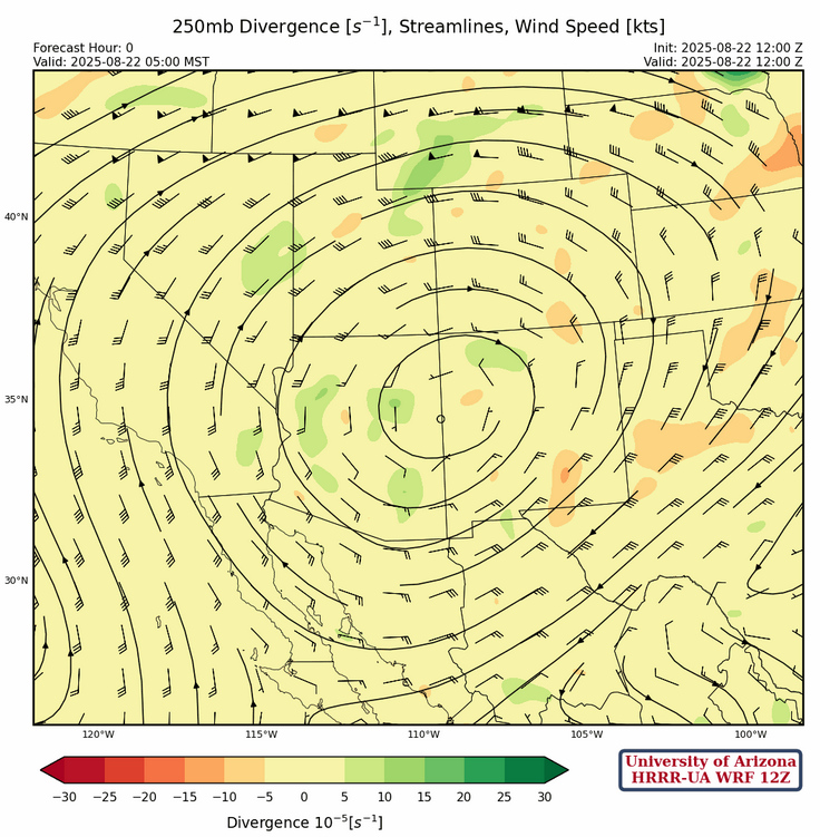 At 250mb, not much has change from yesterday with anticyclonic flow dominating the region. Note the divergence (green contours) over Arizona which should aide in storm development again this afternoon.