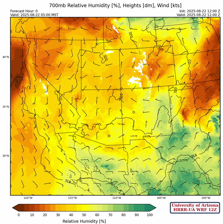 No 5am sounding is available from Phoenix this morning and the Flagstaff sounding was late and may not have been in the 12Z model initializations. The only other sounding in the region was from El Paso. No soundings were available in Colorado, and the combined lack of soundings makes it hard to pinpoint the center of the monsoon ridge.