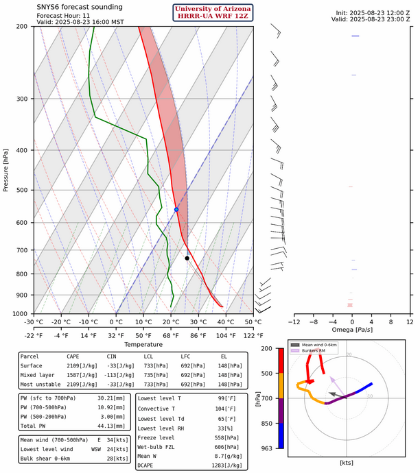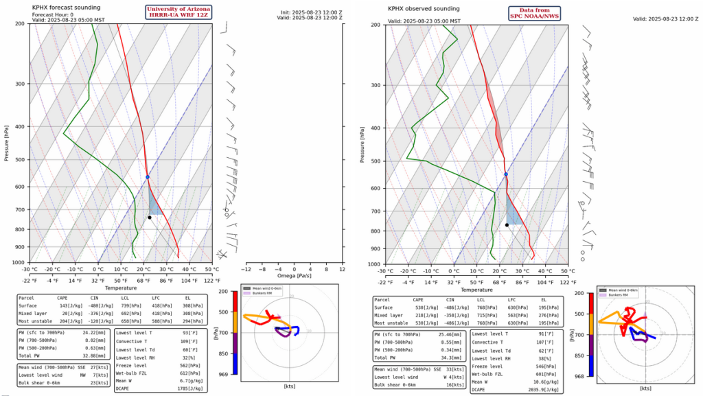 The observed sounding from Phoenix at 5am (below, right) shows less of a subsidence inversion than yesterday and precipitable water is a little higher than the HRRR-UA WRF 12Z initialization (below, left). This sounding would indicate thunderstorm development especially on the Mogollon Rim north of Phoenix and the thermal wind will have the storms moving to the northwest.