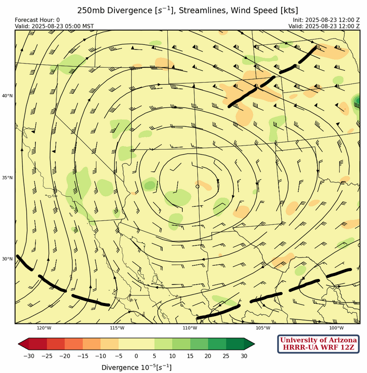 The forecast sounding for Phoenix at 4pm this afternoon shows some Convective Available Potential Energy (CAPE); likely enough for thunderstorms north of the metro area in the mountains, but probably not enough in the metro area itself. Tucson still has too much subsidence forecast to get thunderstorms today (at 500mb on the 1pm forecast sounding below, right).