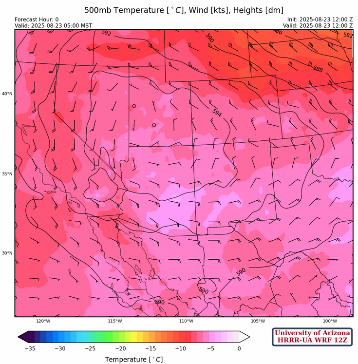 The ridge at 500mb has moved a little further north into southern Utah. Wind speeds have decreased underneath the ridge, so storm motion will be a little slower today. Warmer air is over southeast Arizona and will inhibit convection there. By tomorrow, cooler air from northeast New Mexico will move over southern Arizona.