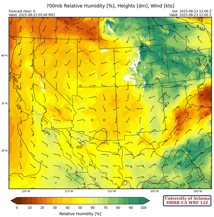 At 700mb, there has not been much change since yesterday and dewpoint temperatures at this level are around 4°C across the region. Given that the subsidence will be less today in some areas, we should see more storms especially west of Tucson.