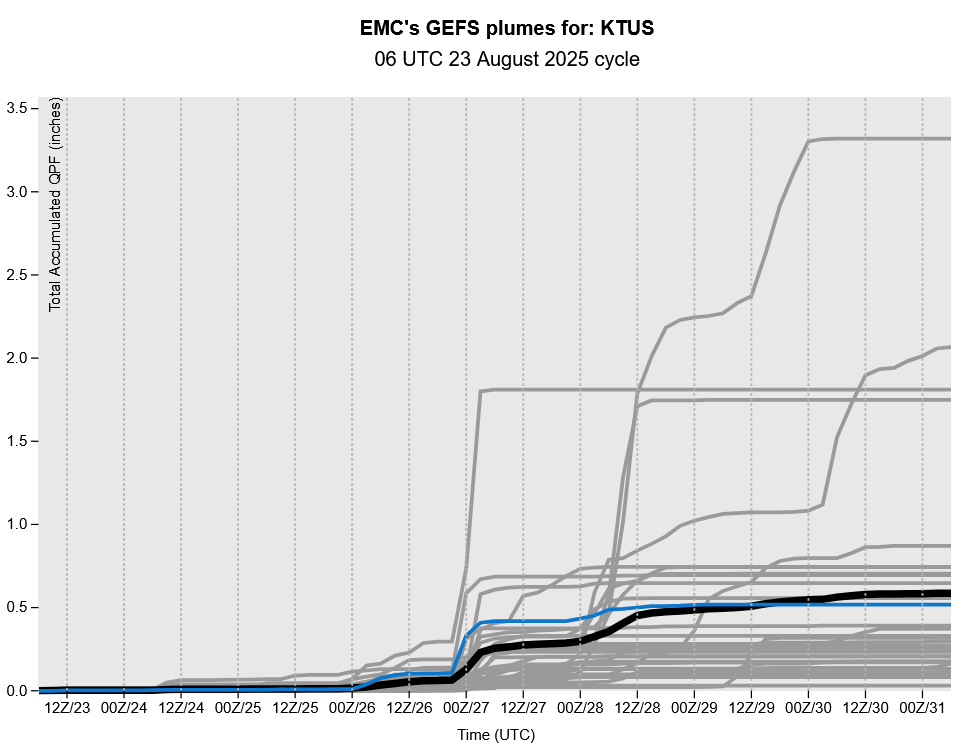 The GEFS plume forecast predicts a few days of precipitation through mid-week (26th to 28th August), but a drying off again for the following weekend. Note the scale is exaggerated by some heavy rain from a few members. But the mean precipitation of a half inch is believable, though uncertainty is high this far out into a forecast. We will probably have another round of storms next week as the monsoon winds down.