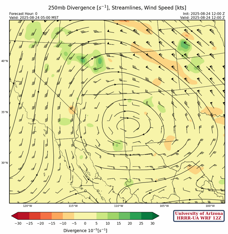 At 250mb, the ridge is beginning to move back towards Texas and will be in the Texas hill country in a couple of days. A trough is in the Pacific Ocean west of the Baja Peninsula and the retreating ridge will increase southerly winds aloft over Arizona ending the subsidence inversion. Upper-level divergence will become more favorable for thunderstorm activity Monday and Tuesday.