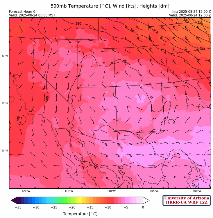 Temperatures have already cooled a couple of degrees at 500mb and should remain about the same over the next few days except in areas where there is induced cooling due to the thunderstorms. Winds have weakened a little and will become from the southeast to south as the ridge shifts eastward.