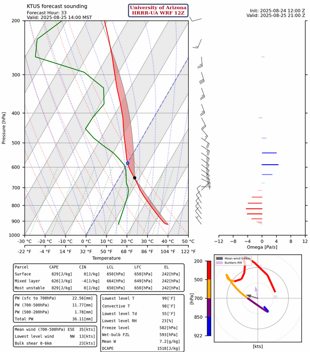 The HRRR-UA WRF 12Z forecast sounding for Phoenix at 5pm has Convective Available Potential Energy (CAPE) this evening while Tucson is still under the subsidence inversion.