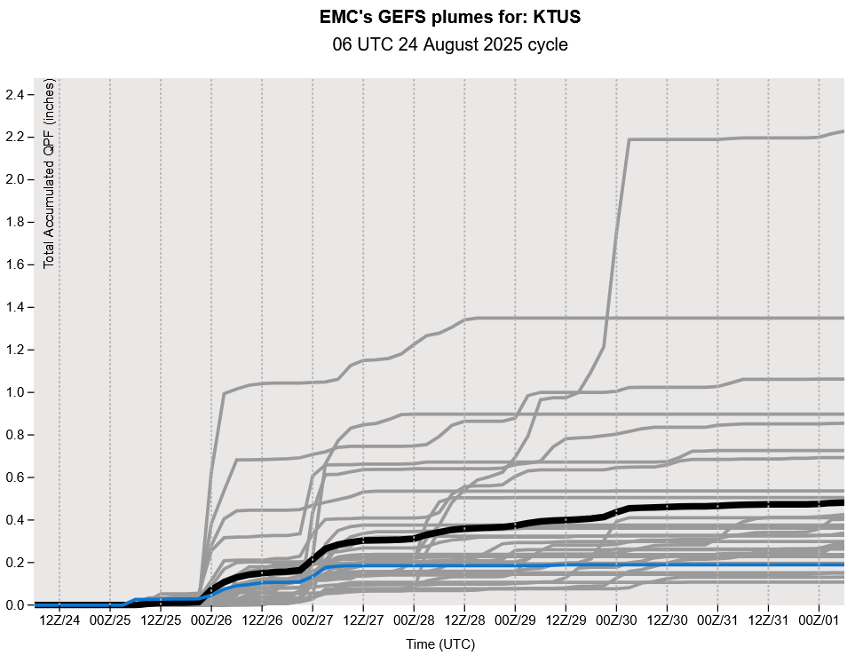 The GFS plume forecast hints that we will go into another dry spell later in the week. The long-range models indicate a couple of chances of rain the following week before the monsoon ends, though these long-range coarse grid forecasts have significant uncertainty for the small scale features associated with monsoon season.