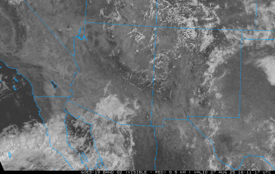 An expanded view visible satellite image shows the mid-level cloud deck moving into Arizona from the southwest that is part of a larger circulation from Tropical Storm Juliette. This is not an ideal direction for moisture to be coming from since only one upper air station can sample the atmosphere (Empalme, Guaymas) with this moisture while most of it is in the Pacific Ocean, we’ll see if observations and, therefore, forecast models can represent it well.