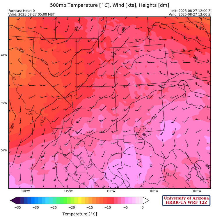 The center of the ridge is in central Texas at 500mb, and the trough is off the west coast. The flow over the region has shifted from southerly to the southwest with a few degrees of warming as supported by the observed Phoenix sounding shown above.