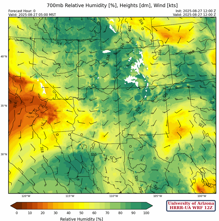At 700mb, although the relative humidity values appear high the dewpoint temperatures have dropped a few degrees. Moisture in New Mexico remains about the same as yesterday.