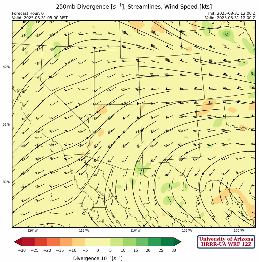 The center of the sub-tropical high-pressure ridge is in south Texas at 250mb, with a ridge axis extending west to the northern Gulf of California. The trough that was over the Rocky Mountains has now moved into the Great Plains, with another trough over the west coast. Over Arizona and New Mexico, winds are from the southwest with speeds around 35 knots. Some divergence is indicated over southeast Arizona and southern New Mexico north of the ridge axis.