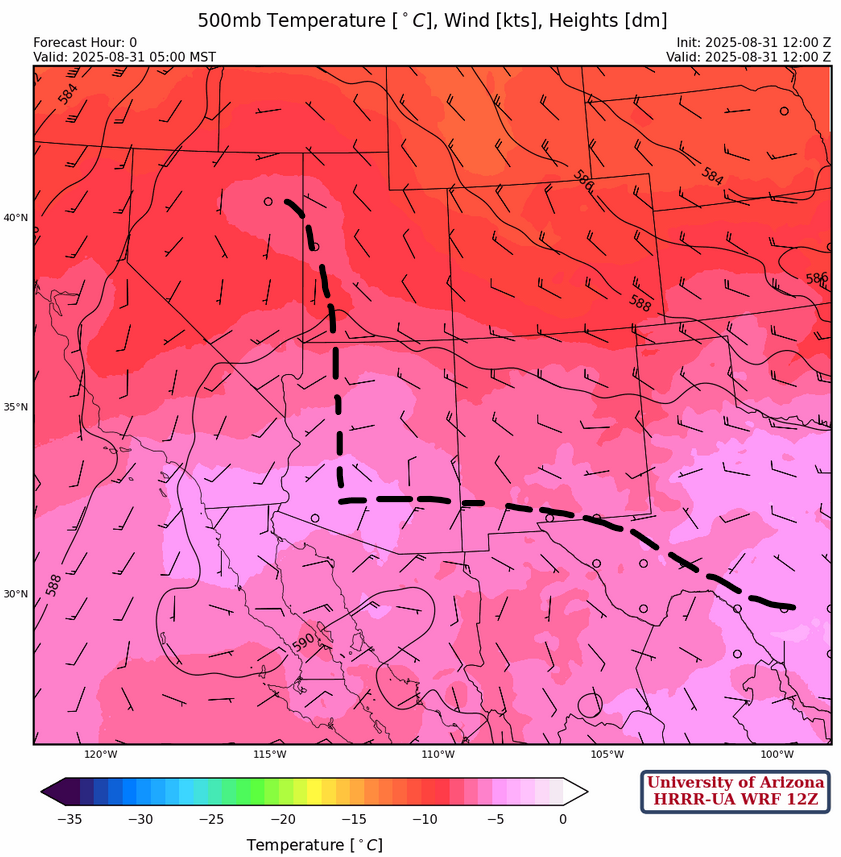 The HRRR-UA WRF 12Z forecast predicts a Rim Shot bringing strong winds into Phoenix, but that may be overestimating what might occur since the storms in Pinal and Graham counties tomorrow are a little too weak for the type of winds shown by the forecast. What is more important for tomorrow’s forecast is the easterly wind flow across southern New Mexico into southern Arizona. This will spread dry air into the state with no significant storms in southeast Arizona.