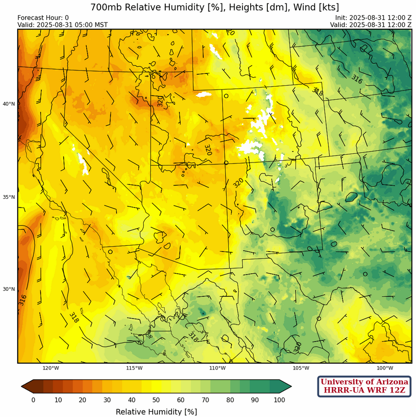 At 700mb, the ridge is centered along the Utah/Colorado border. Initially, moist air from New Mexico will move into Arizona over the next few days, but the circulation around the ridge will bring drier air into most of the region by the middle of the week.