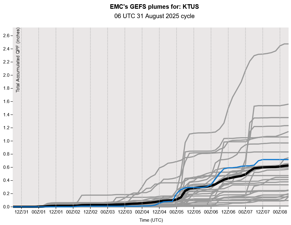 The GEFS plume forecasts have been very consistent ramping up precipitation later next week, though these are coarse resolution long-range forecasts with significant uncertainty. Monsoon moisture is predicted to be drawn northward into the Arizona by a trough along the west coast. Accumulated precipitation totals remain low at least until next weekend.